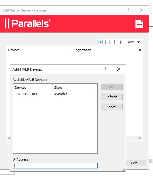 - Click Tasks > Add and select or specify a HALB device. If you haven't deployed any HALB devices (appliances) yet, you can still save the Virtual Server configuration and assign HALB devices to it later. At least two HALB devices are recommended per Virtual Server. HALB device priority is set by positioning a device in the list. The device at the top is the primary HALB device. Devices under it are secondary HALB devices. To promote a device to primary, simply move it to the top of the list.