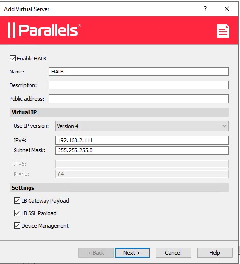 - In the Virtual IP section, specify the virtual IP address properties which will be used for incoming client connections by a HALB device that you will assign to this Virtual Server later.