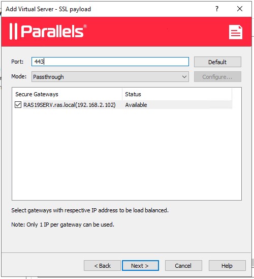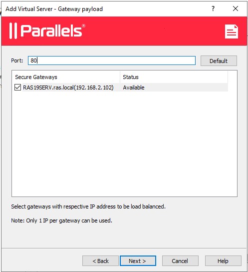 - In the Gateways list, select a RAS Secure Gateway to be load balanced. Please note that only one IP address per gateway can be used. If you have more than one entry for the same gateway with different IP addresses, you can select just one