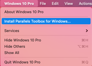 1. Click on the virtual machine name in the application menu bar, then select Install Parallels Toolbox for Windows.