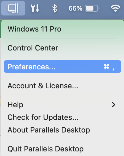 1. Click on the Parallels logo in the menu bar and select Preferences in the drop-down menu.