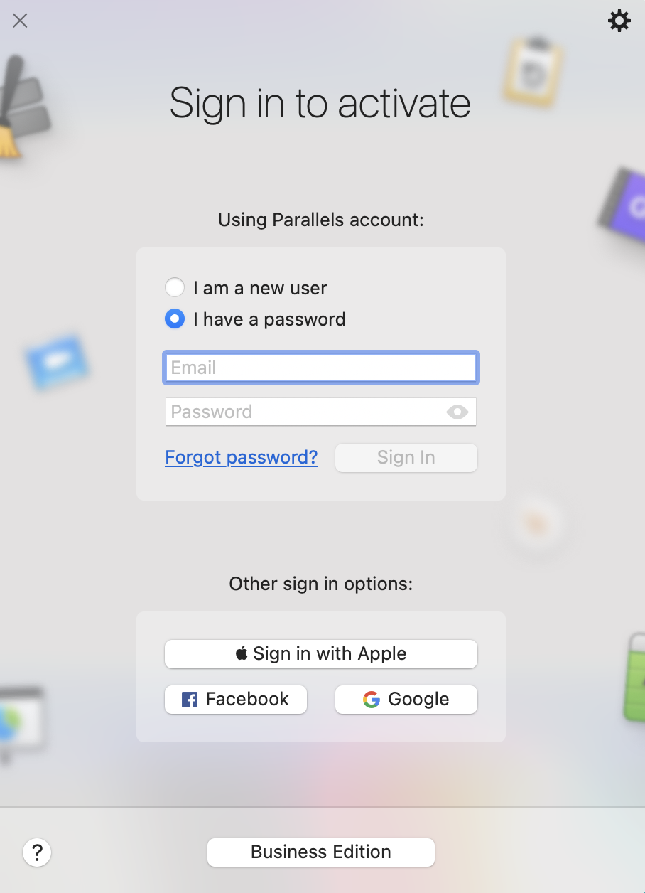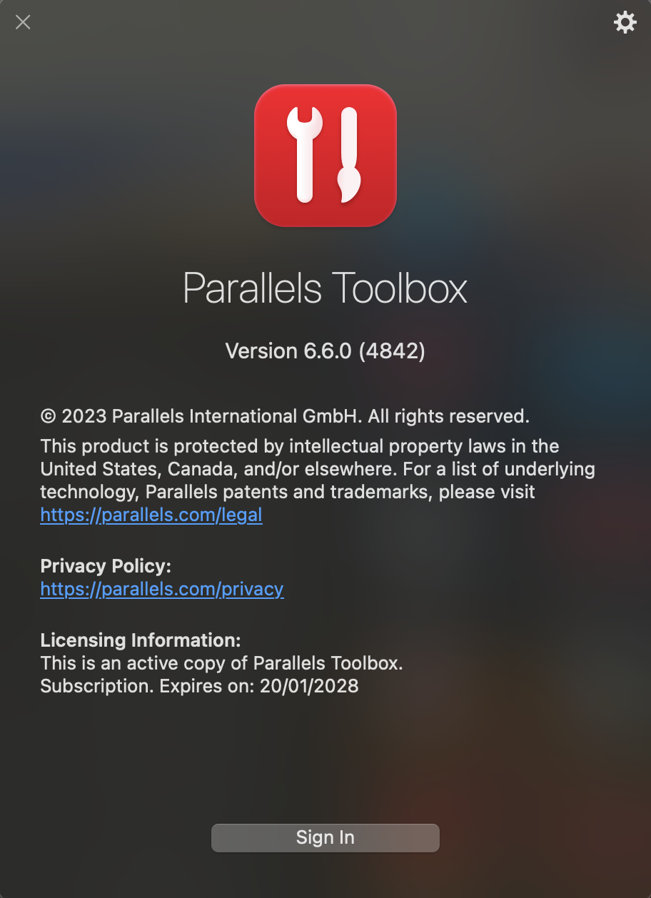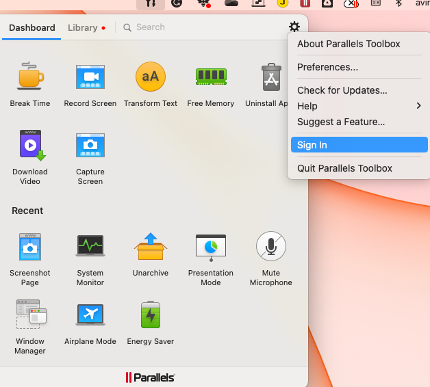 2. Start Parallels Toolbox. Click on the Parallels Toolbox icon > click on the Cogwheel > click Sign in.