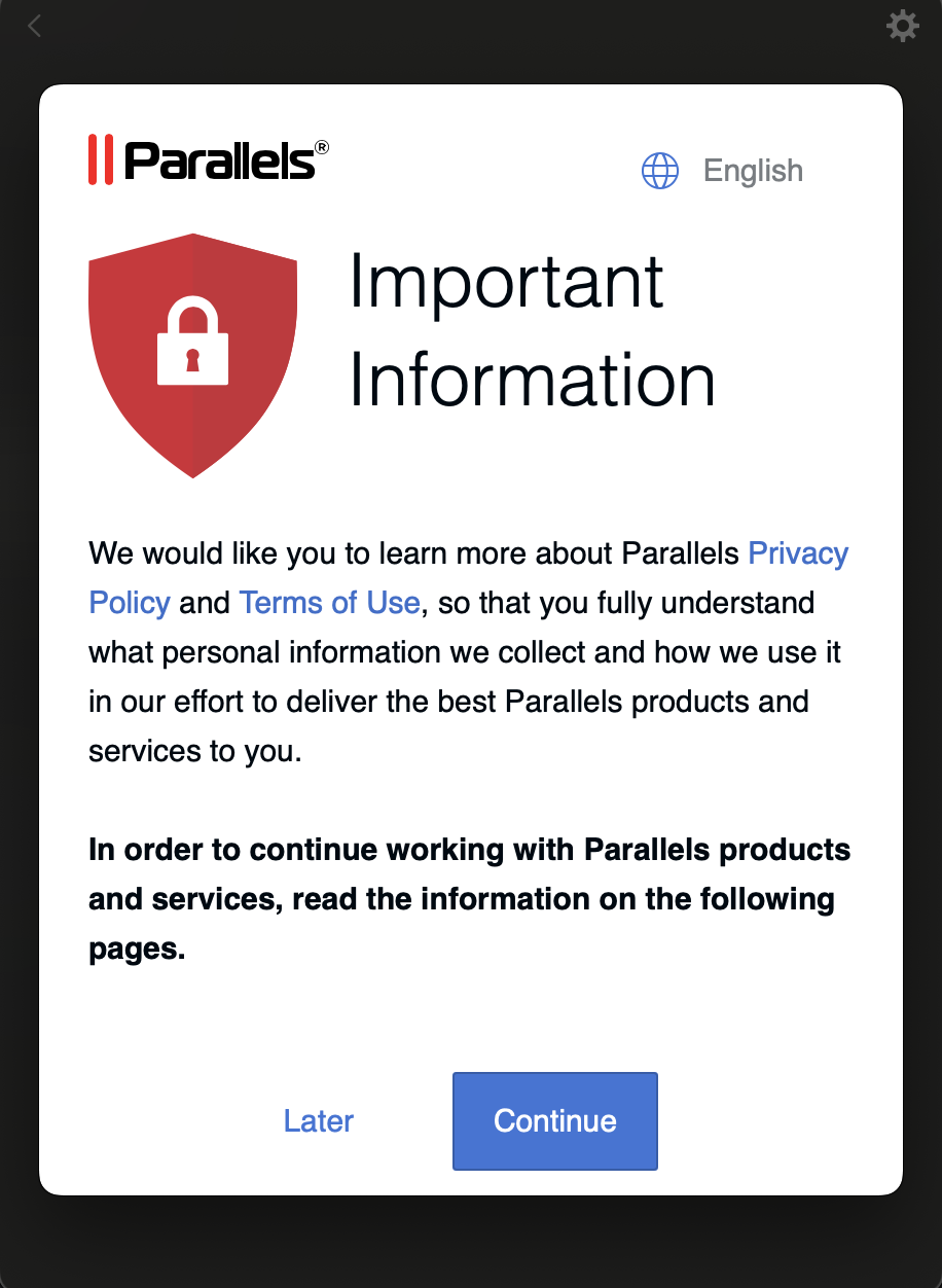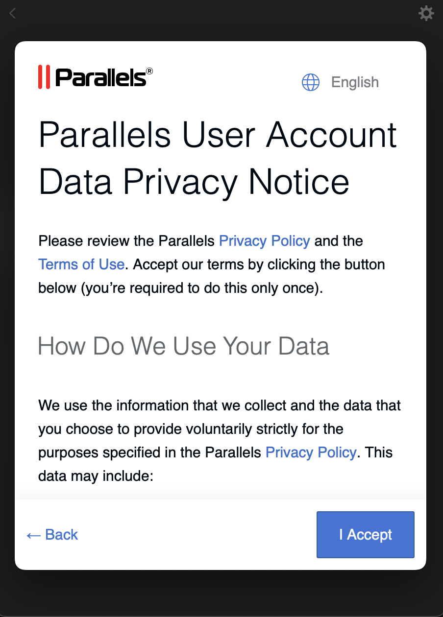 6. Once you have read the "Parallels User Account Data Privacy Notice", click on I Accept.