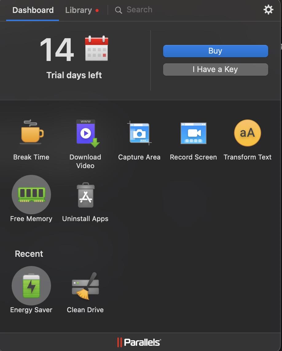 You can purchase the full version at any time during your trial period and reactivate your copy with it. Open the Parallels Toolbox application and click on Buy to make a purchase, or click I Have a Key if you have already purchased a license to activate the product.