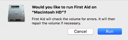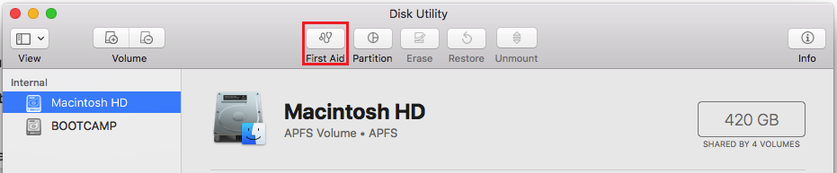 2. Select a disk in question (its name Macintosh HD by default, if the disk wasn't renamed) and then click on First Aid button.