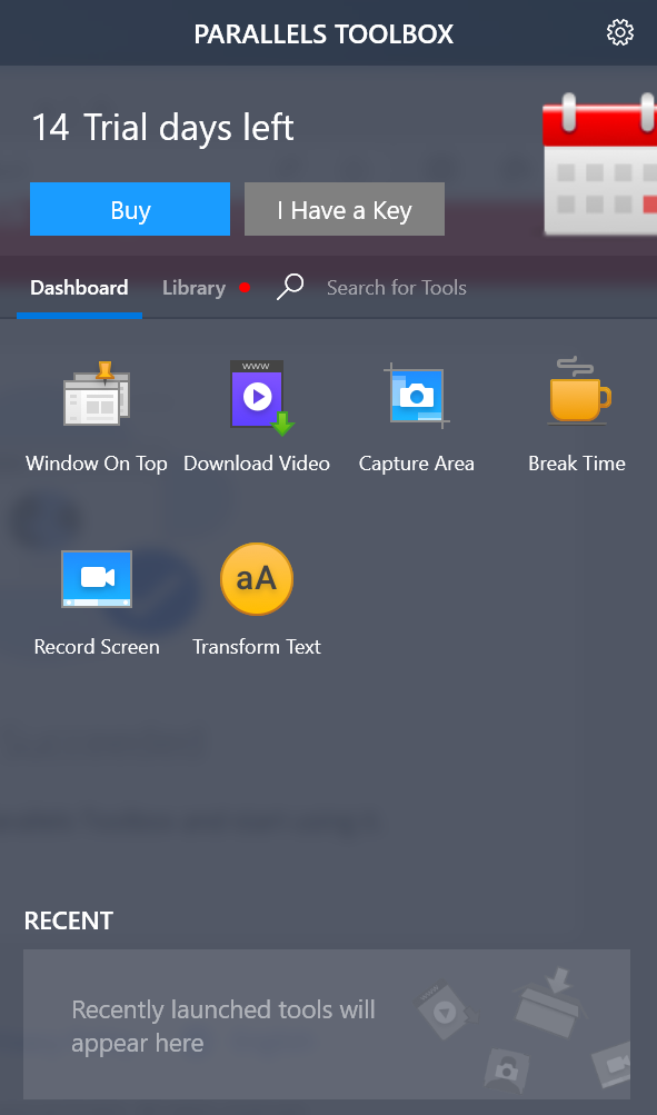 You can purchase the full version at any time during your trial period and reactivate your copy with it. Open Parallels Toolbox and click on Buy to make a purchase, or click on I Have a Key if you have already purchased a license.