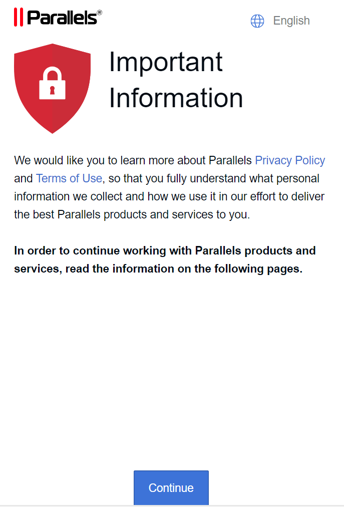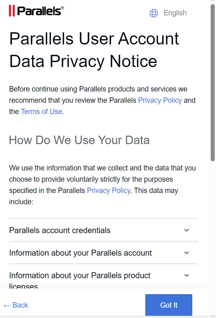 4. Once you have read the "Parallels User Account Data Privacy Notice", click on Got it.
