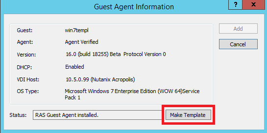 RAS will power on the guest and check if Guest Agent is installed. Once it is done click on Make Template button: