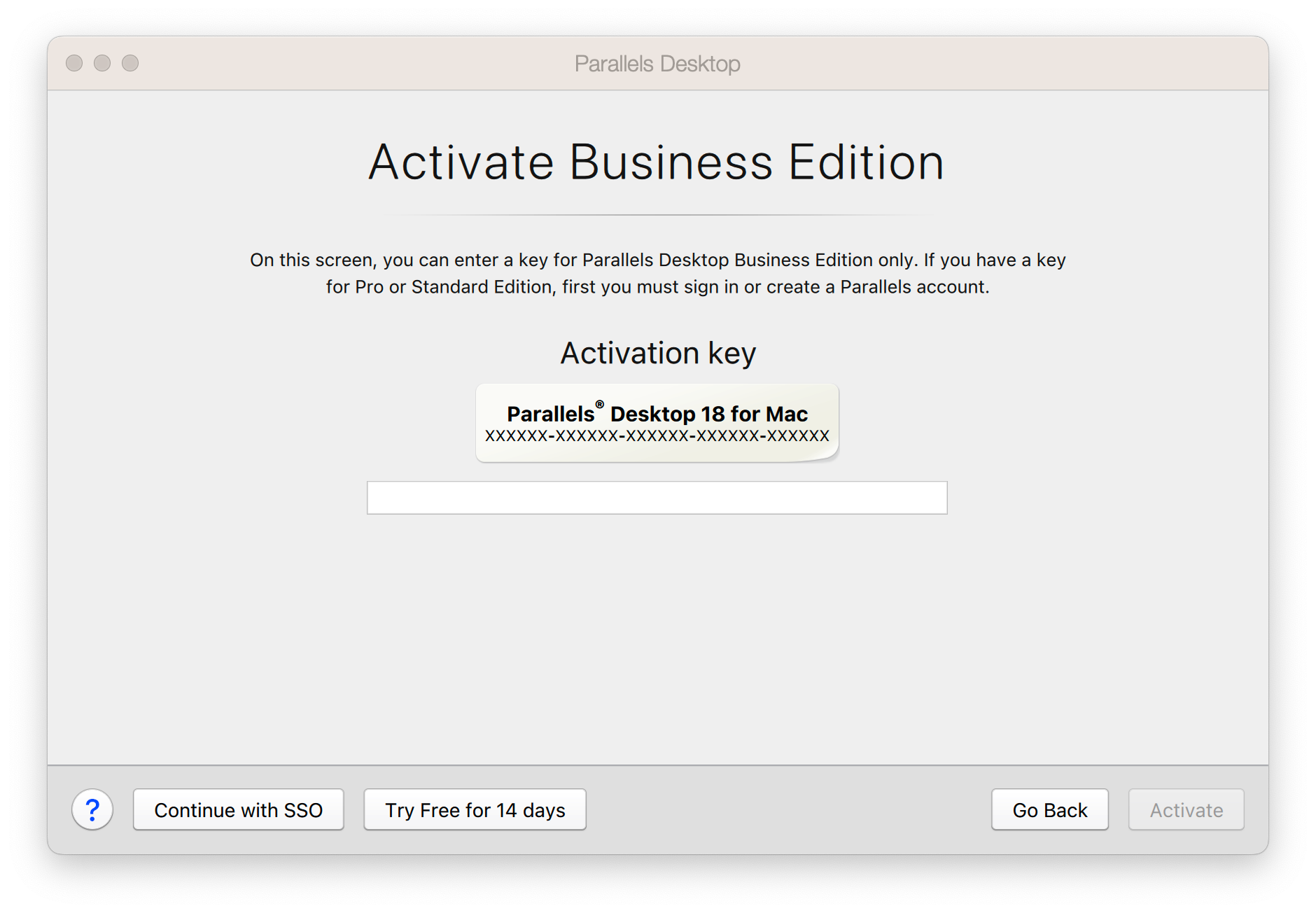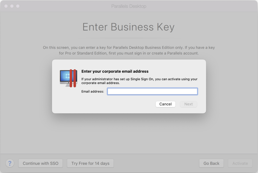 These steps apply for cases when you have been provided with a Parallels Desktop for Business license key: