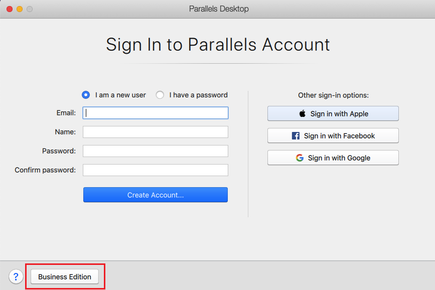 1. Upon starting Parallels Desktop, click Business Edition.
