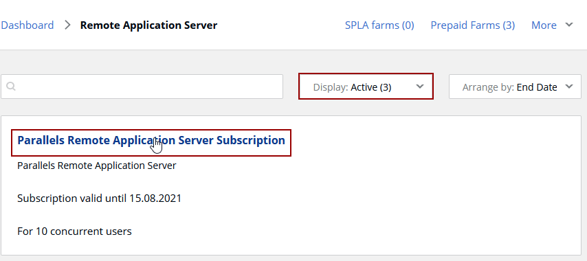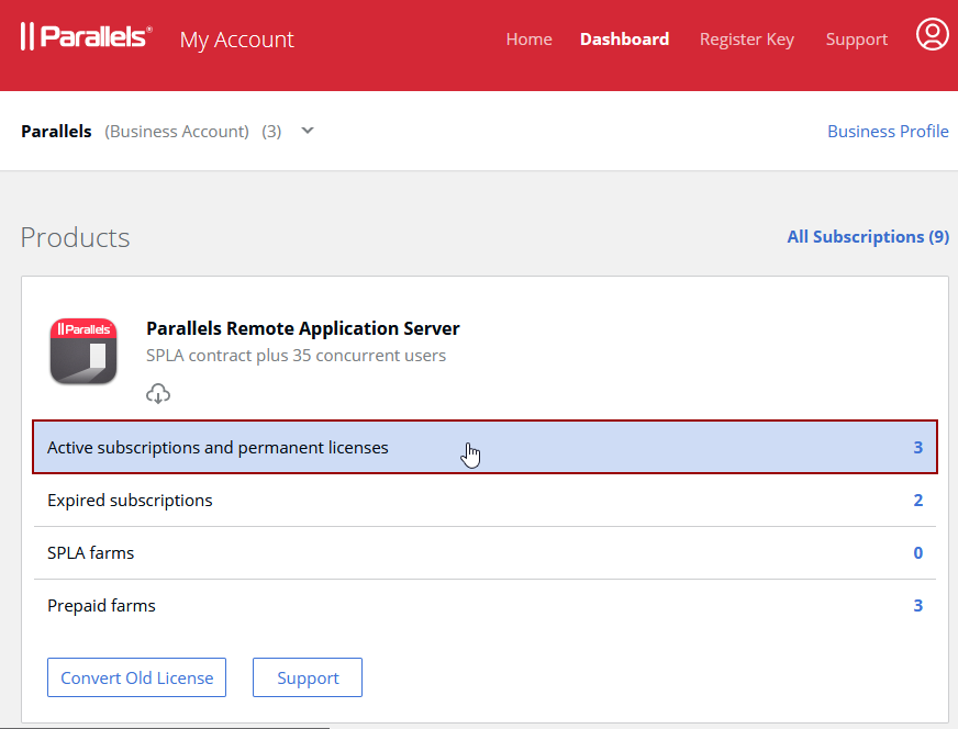 2. Open Parallels business account Dashboard and click on Active subscriptions under the product in question: