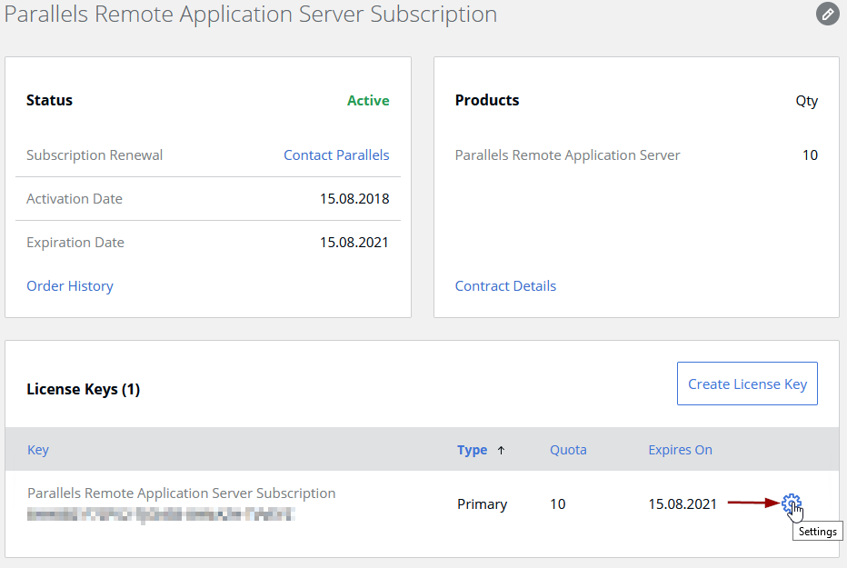 4. Locate the exact license key that should be managed by the account member and click on the cogwheel next to the license: