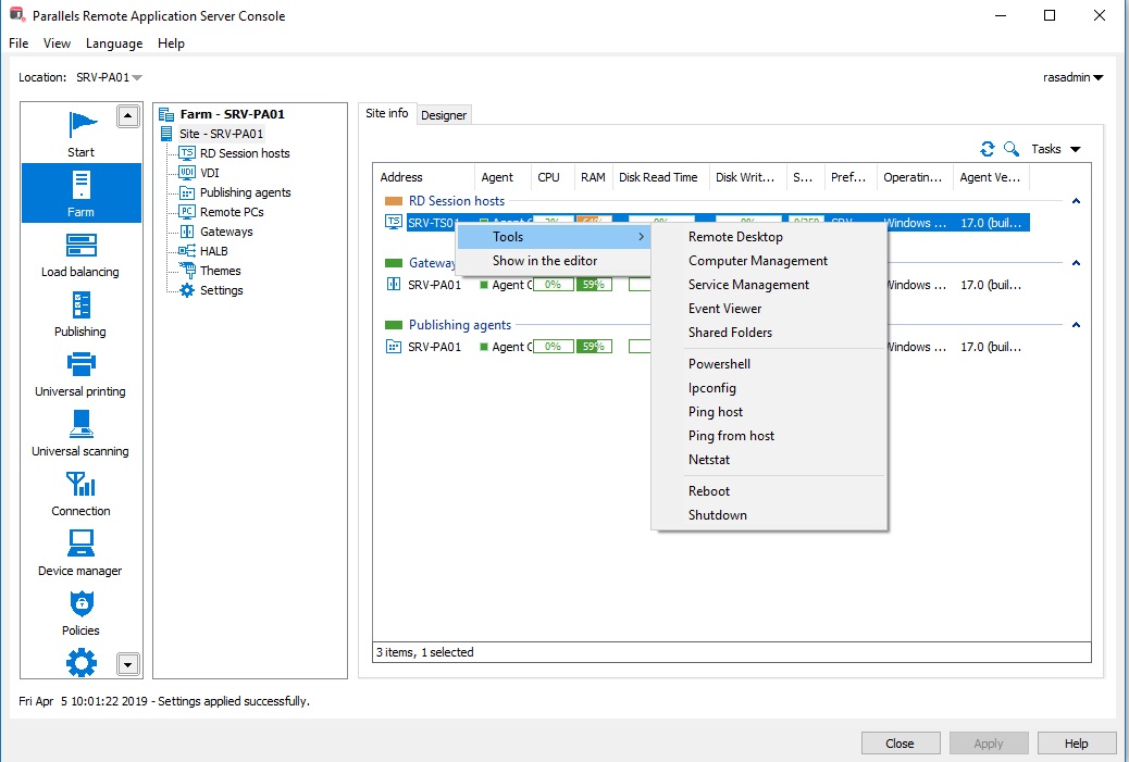 To access the Tools menu, select a server in the Parallels RAS Console and then click Tasks (or right-click) > Tools.