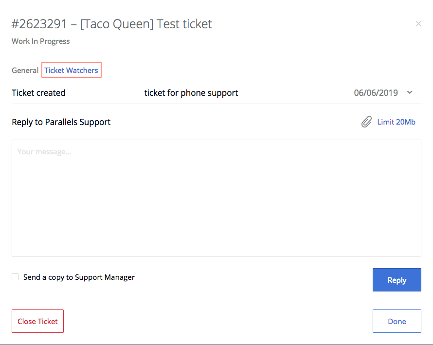 Once added, the person will receive an email notifications about ticket updates and will be able to view this ticket in his Parallels account's My Tickets page.