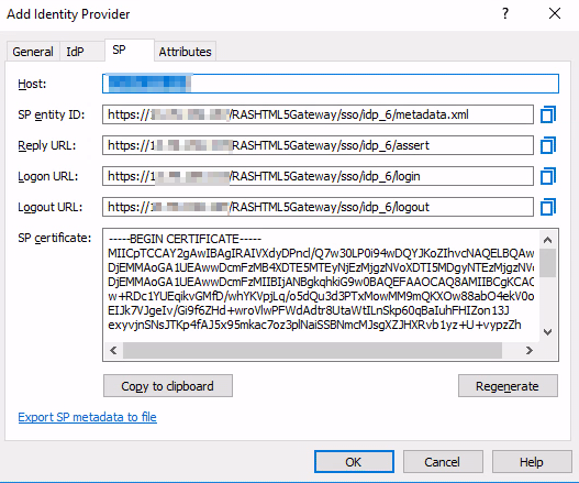 3. Copy and save values for “SP entity ID”, e.g. https://IPADDRESS/RASHTML5Gateway/sso/idp_6/metadata.xml and “Reply URL”, e.g. https://IPADDRESS/RASHTML5Gateway/sso/idp_6/assert
