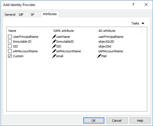 3. Switch to Attributes tab and select the appropriate attribute for you. In our example this will be Custom, SAML = email, AD = Mail