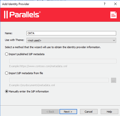 2. In the opened Add Identity Provider wizard, give it a name (e.g. Okta), choose “Manually enter the IdP information” and click Next.