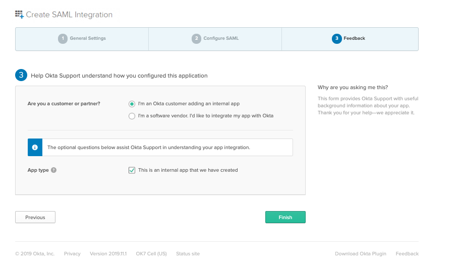 3. On the next page enter any information to satisfy the requirements to not leave the fields blank, (we will import Okta settings using metadata file later) and click Finish.