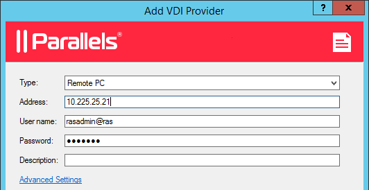 3. Select Remote PC in the Type drop-down list. In the Address field, specify FQDN or IP address of a server that will manage Remote PC pools. This must be a server with RAS VDI Agent installed. You can use the RAS Publishing Agent server, since it has the RAS VDI Agent built in, but it can be any other server running a dedicated RAS VDI Agent. Enter the account name in the UPN format (e.g. administrator@domain.local). This must be a domain user account with sufficient rights to manage individual remote PCs that will be assigned to this host. Using a local Windows account is also possible with some limitations and only when using the static PC assignment. Using a domain account is recommended. Enter the account password and an optional description. Click Next and then click Finish: