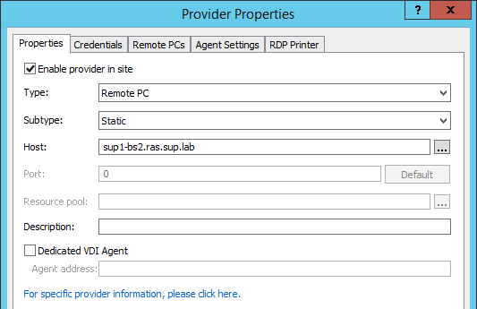 The wizard closes and the Provider Properties dialog opens where you need to configure the new VDI provider. You can configure it now or you can configure it later by right-clicking the host on the Providers tab and choosing Properties.