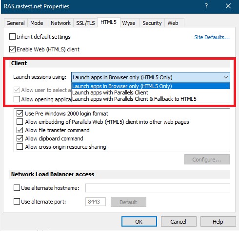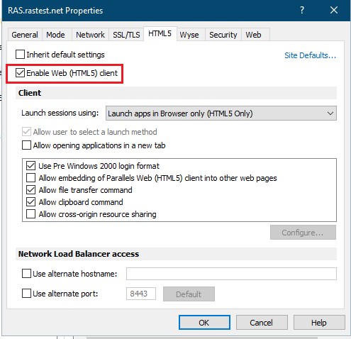 To configure Web Client, click the HTML5 tab in the RAS Secure Gateway properties dialog and then set the options described in the subsequent sections.
