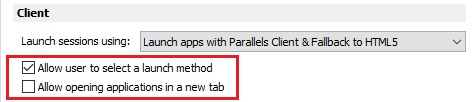 • Allow users to select a launch method: If selected, users will be able to choose whether to open remote applications in a browser or in Parallels Client. You can enable this option only if the Launch session using option (above) is set to launch apps in Parallels Client and fall back to HTML5 (i.e. both methods are allowed).