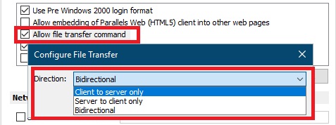 • Allow file transfer command: Enables file transfer in a remote session. To enable file transfer, select this option and click the Configure button. In the dialog that opens, select Client to server only (transfer files from client to server only), Server to client-only (transfer files from the server to client only), or Bidirectional (transfer files in both directions).
