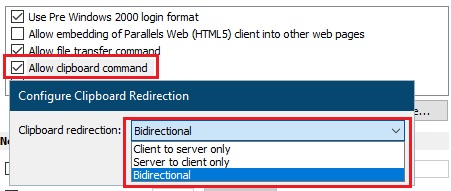 • Allow clipboard command: Enables clipboard operations (copy/paste) in a remote session. To enable the clipboard, select this option and click the Configure button. In the dialog that opens, select Client to server only (copy/paste from client to server only), Server to client-only (copy and paste from server to client only), or Bidirectional (copy and paste in both directions).
