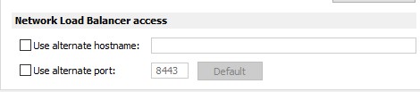 The Network Load Balancers access section is intended for deployment scenarios where third-party front-end load balancers such as Amazon Web Services (AWS) Elastic Load Balancers (ELBs) are used. It allows you to configure an alternate hostname and port number to be used by the Network Load Balancer (NLB). This is needed to separate hostnames and ports on which TCP and HTTPS communications are carried out because AWS load balancers don't support both specific protocols over the same port.