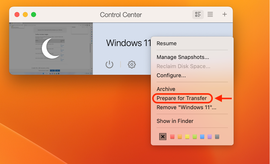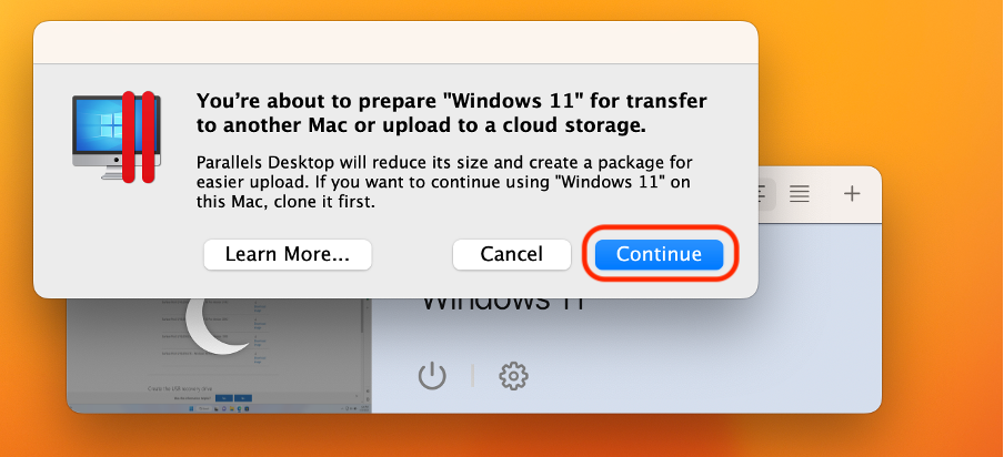 To prepare a final image for your end-users, open the Parallels Desktop Control Center, select the VM where you’ve completed the steps above, right-click on it, select the Prepare for Transfer option to compress the VM, and then click Continue.