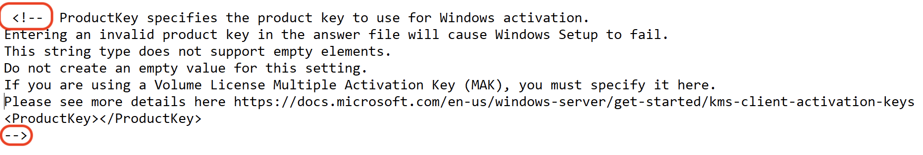 You may find our sample file for both x86-64 and Arm Windows versions here, the file can be used with either architecture. Since the answer file covers both x86 and ARM architectures, any changes to the file should be done to the part of the file that matches the end user's architecture. Download the file and open it in a text editor of your choice. Change the specified parameters as needed and activate the ones you plan on using by uncommenting the corresponding strings. To uncomment the strings, remove the “<!--” sequences at the beginning and the “-->” sequences at the end of them, along with the explanations, as displayed in the image below.