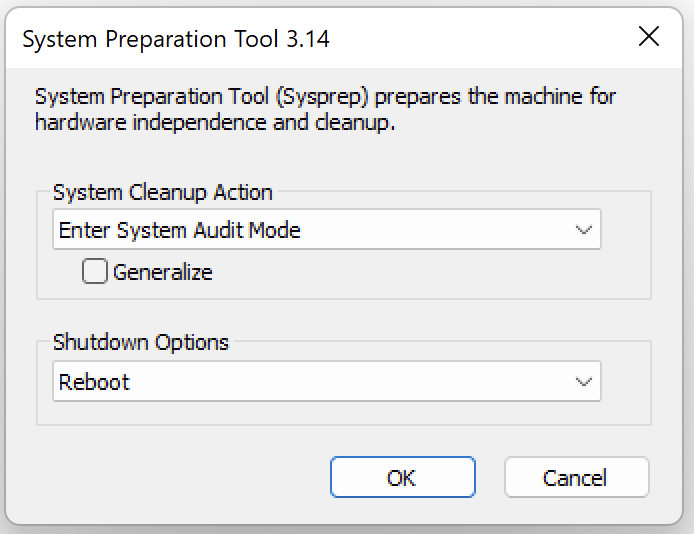 Start the reference VM created above and then launch Audit mode. To launch Audit mode, launch Sysprep (C:\Windows\System32\Sysprep\sysprep.exe) with the following arguments: