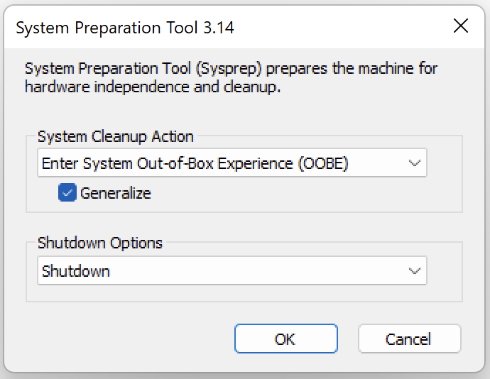 C:\Windows\System32\Sysprep\Sysprep.exe /unattend:C:\Windows\Setup\Scripts\answer.xml /oobe /generalize /shutdown