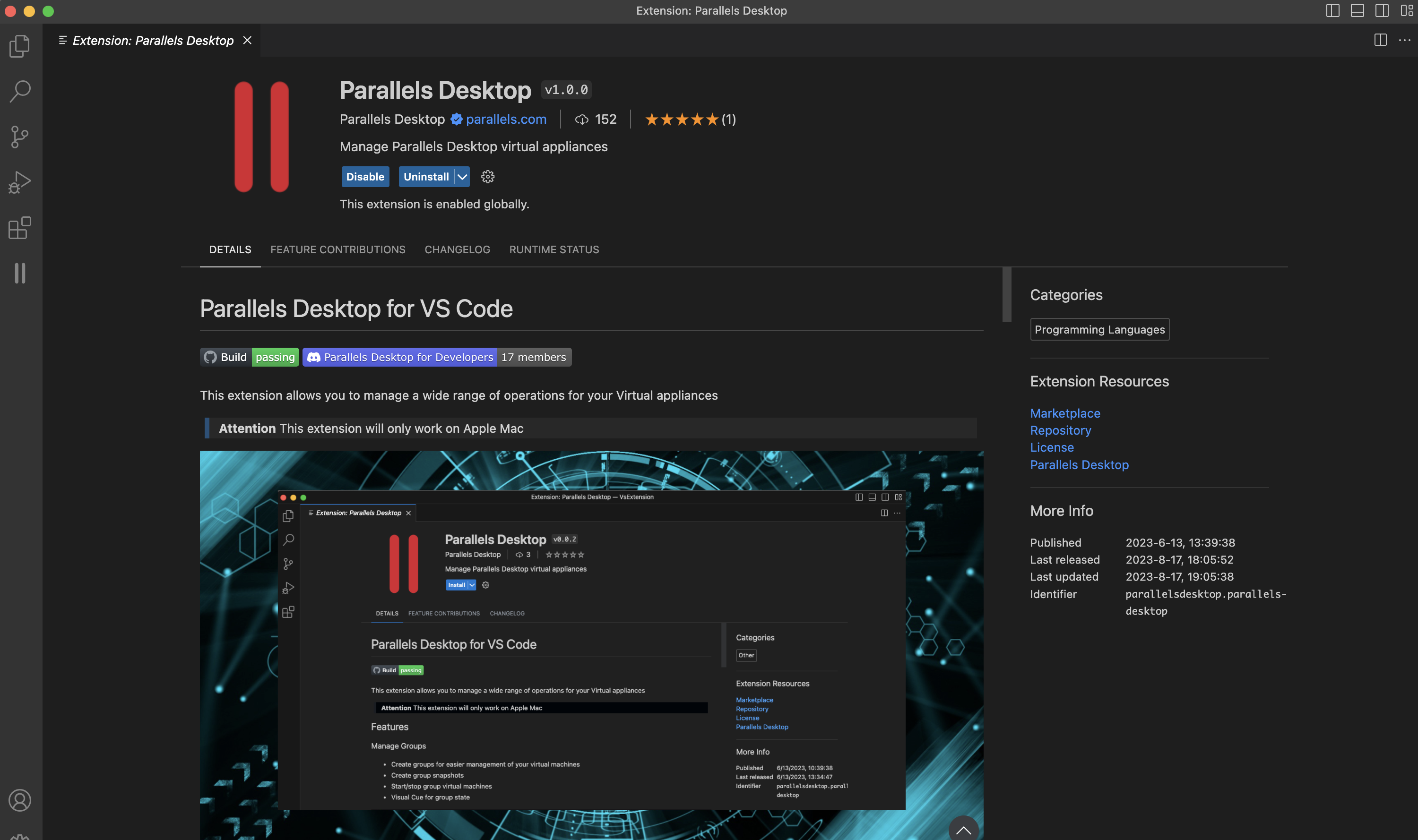 Note: this extension will only work on Apple Mac and requires Parallels Desktop Pro or Business Edition license.