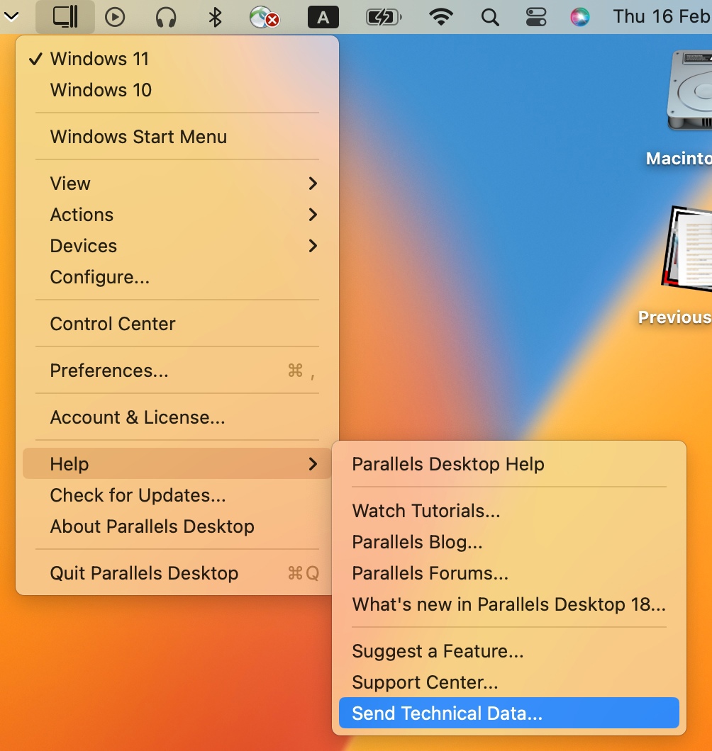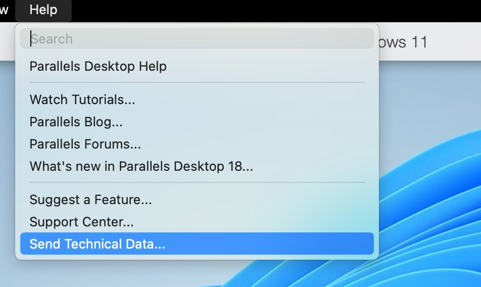 If you are using Coherence mode, click on the Parallels icon on macOS menu bar, and select Help menu > Send Technical Data...