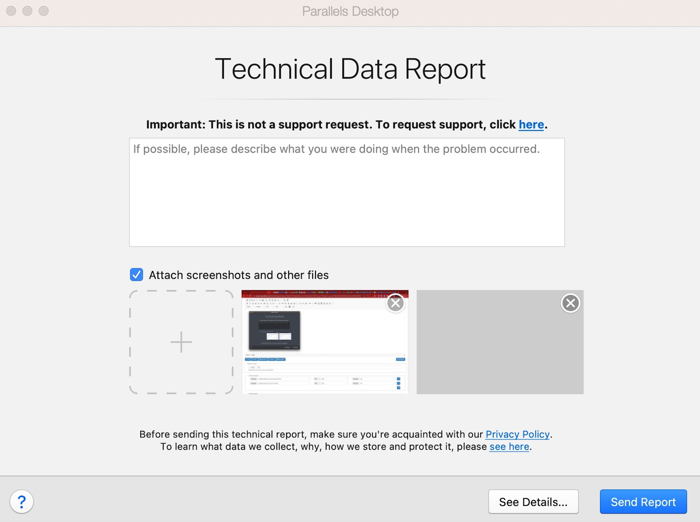 Technical data report consists of computer configuration information, log files, and Parallels account & license information. Parallels Engineering and Support teams use this information to diagnose and troubleshoot reported issues. The technical report does not include any sensitive information apart from the displayed screenshot but you can also detach it from the report. For more information about technical data report details, please refer to KB 114025.