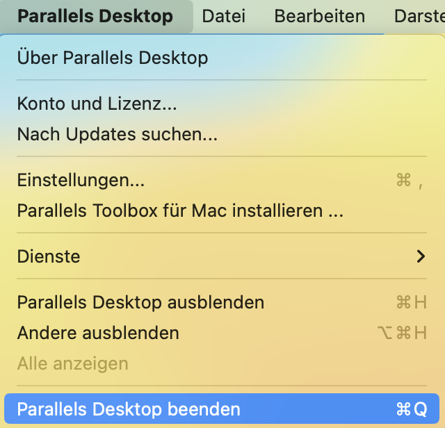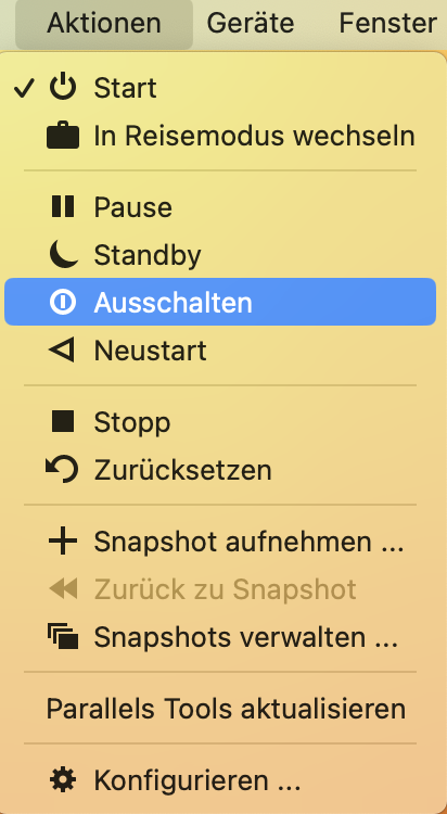 1. Fahren Sie Ihre virtuelle Maschine herunter und beenden Sie Parallels Desktop.