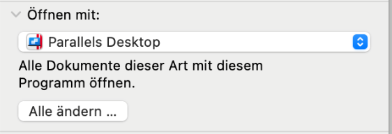 Hinweis : Die .ipsw-Datei sollte so konfiguriert sein, dass sie von der Parallels Desktop-App geöffnet werden kann. Klicken Sie dazu einfach mit der rechten Maustaste auf die .ipsw-Datei > Informationen abrufen > wählen Sie im Abschnitt „Öffnen mit“ Parallels Desktop aus und klicken Sie auf „Alle ändern“.