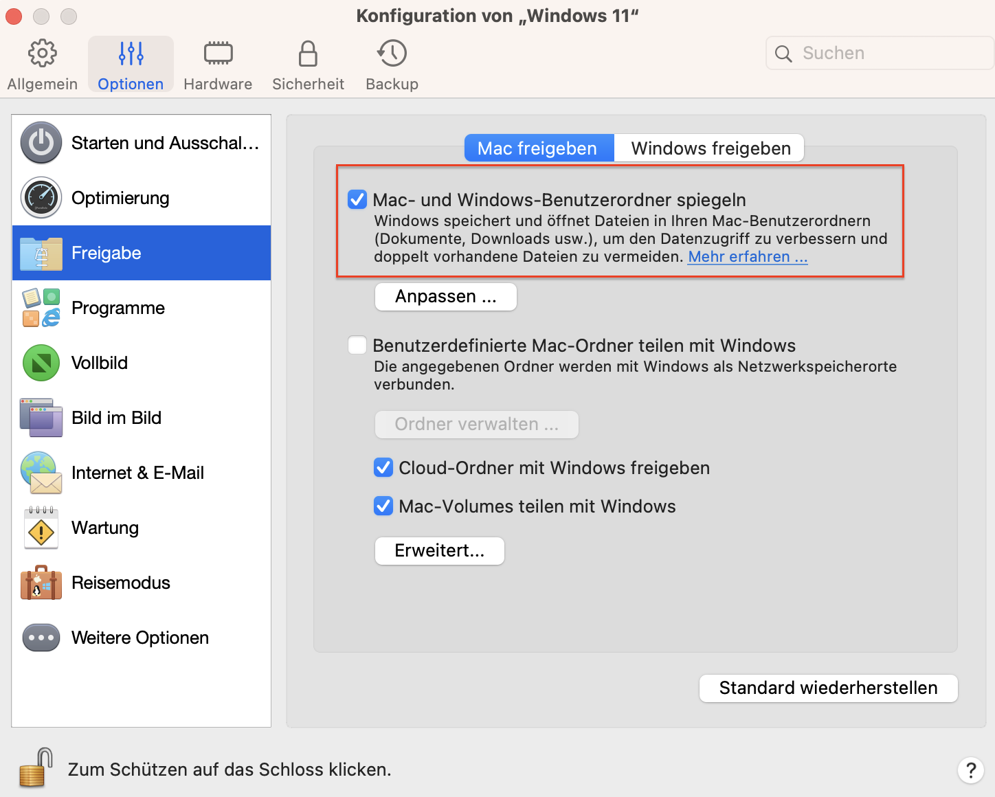Mit unserer Funktion Freigegebene Profile können Sie von Ihrer Windows-VM aus auf Dateien und Ordner auf Ihrem Mac zugreifen. Die Einstellungen können in der VM-Konfiguration > Optionen > Freigabe > Mac- und Windows-Benutzerordner spiegeln gesteuert werden.