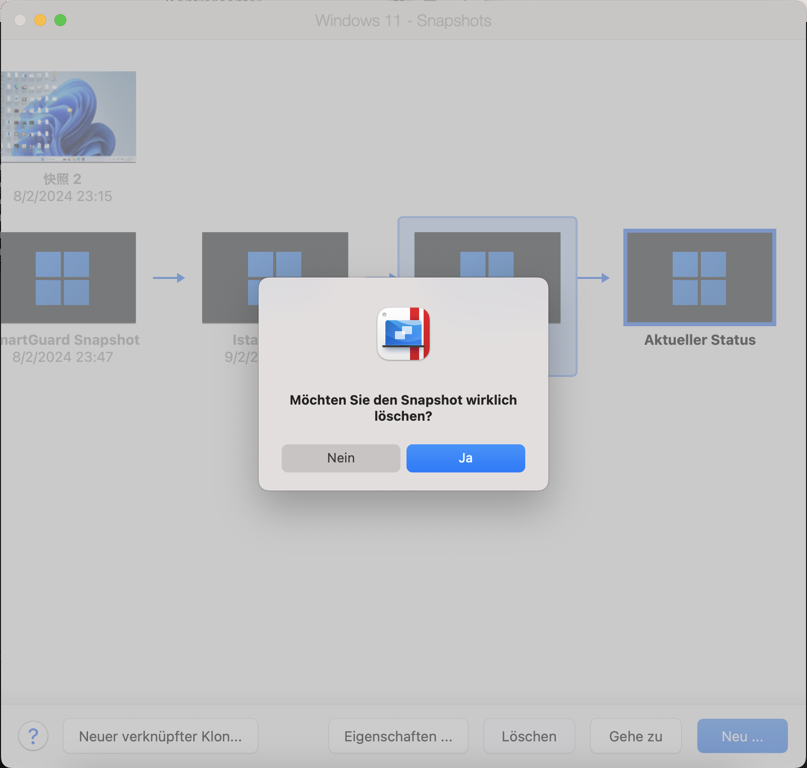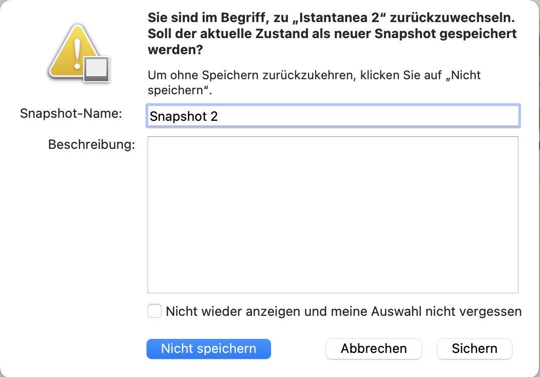 Hinweis: Wenn Sie Speichern wählen, erstellt Parallels Desktop einen zusätzlichen Snapshot mit dem Zustand, den Sie hatten, bevor Sie zum vorherigen Snapshot zurückgekehrt sind. Wenn Sie Nicht speichern wählen, kehren Sie zum vorherigen Snapshot zurück, ohne den aktuellen Zustand zu speichern.