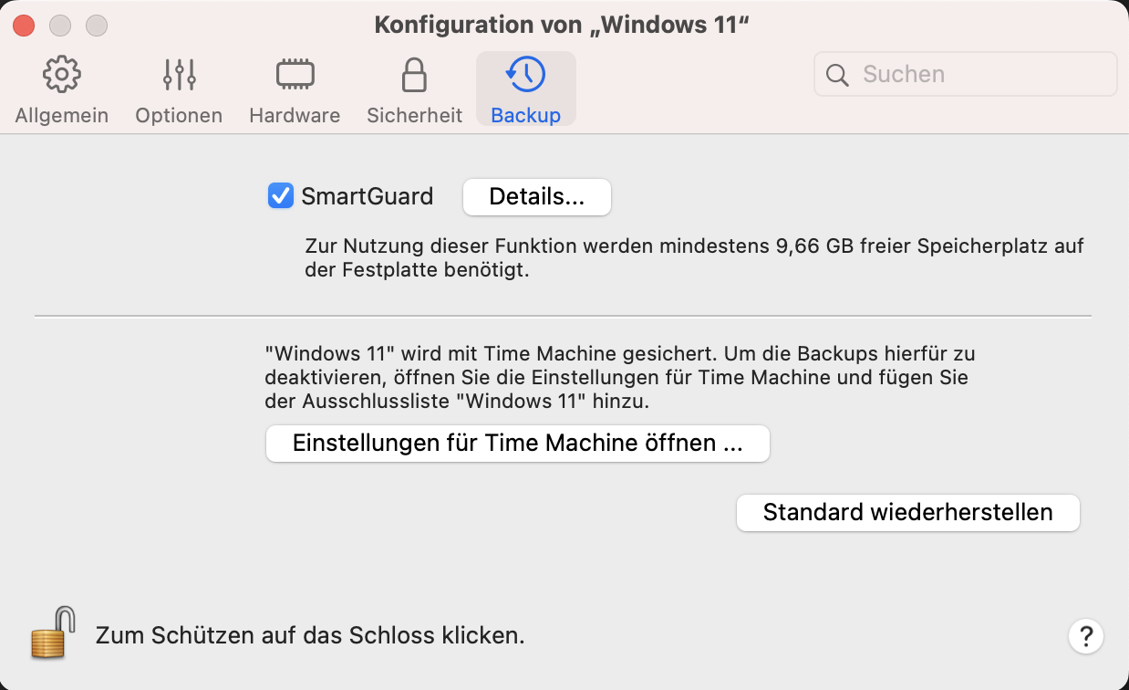 Wenn Sie Time Machine verwenden, empfehlen wir, SmartGuard zusammen mit dieser Option zu aktivieren. Wenn Sie diese Option auswählen, wird alle 24 Stunden ein Snapshot erstellt. Wenn Time Machine Ihren Mac sichert, wird nicht die gesamte virtuelle Maschine gesichert, sondern nur der letzte Snapshot. Auf diese Weise können Sie die Datenmenge, die Time Machine sichert, reduzieren, die Zeit, die Time Machine für die Sicherung der virtuellen Festplatte(n) benötigt, verringern und das Risiko eines Datenverlusts oder einer Datenbeschädigung bei der Wiederherstellung der Festplatte(n) der virtuellen Maschine aus dem Time Machine Backup minimieren.
