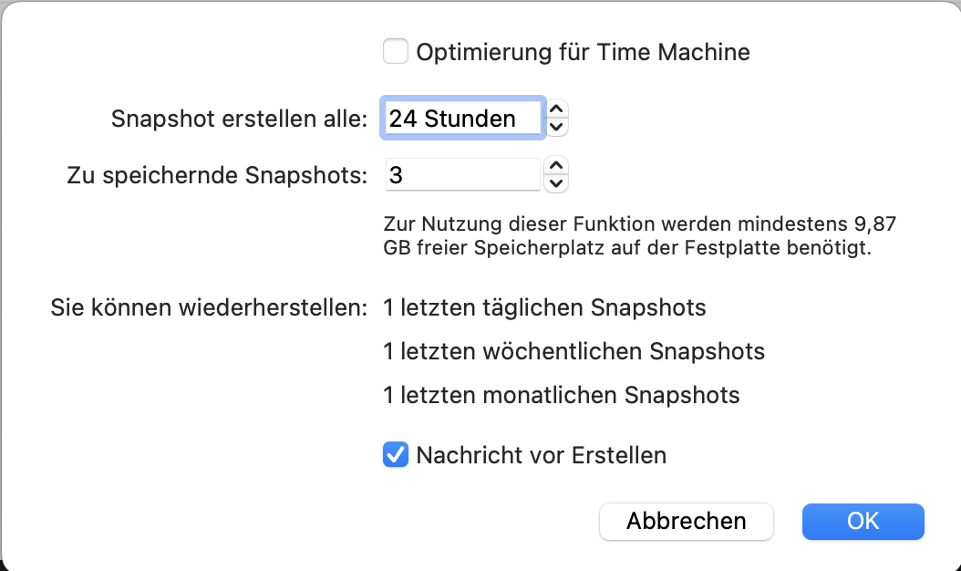 Verwenden Sie das Feld Zu behaltende Schnappschüsse, um die maximale Anzahl von Schnappschüssen festzulegen, die auf Ihrem Mac gespeichert werden können.