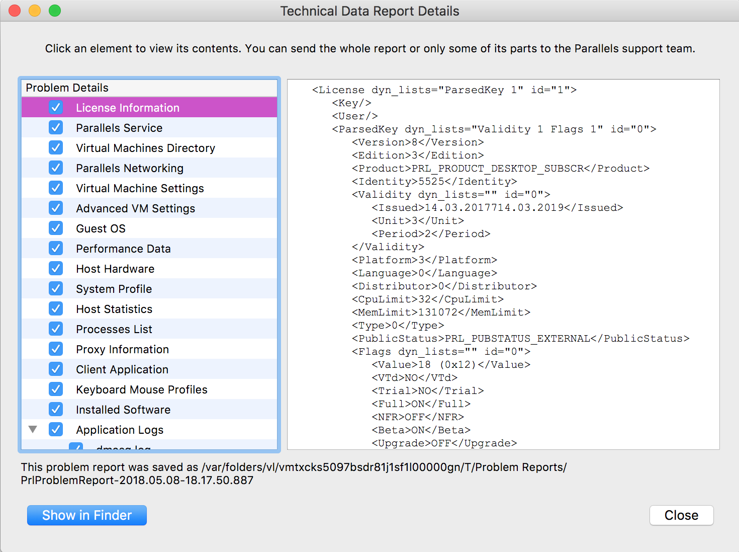 Technical data report contains an essential information about your environment that helps Parallels Support and Engineering teams to diagnose product issues on your computer: