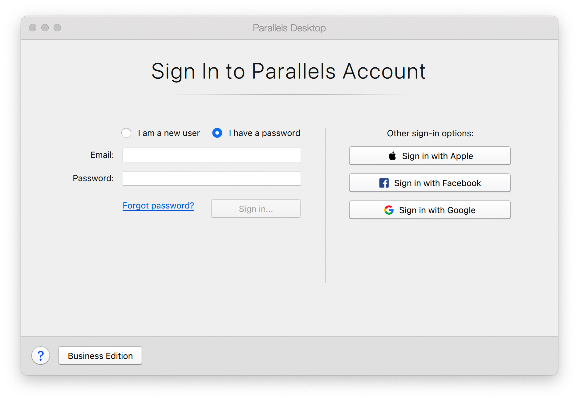 Start Parallels Desktop, create a virtual machine, for example, a Windows virtual machine. As soon as you start the virtual machine, you will see the registration window. Create or sign in to an existing Parallels account.
