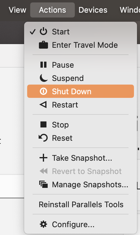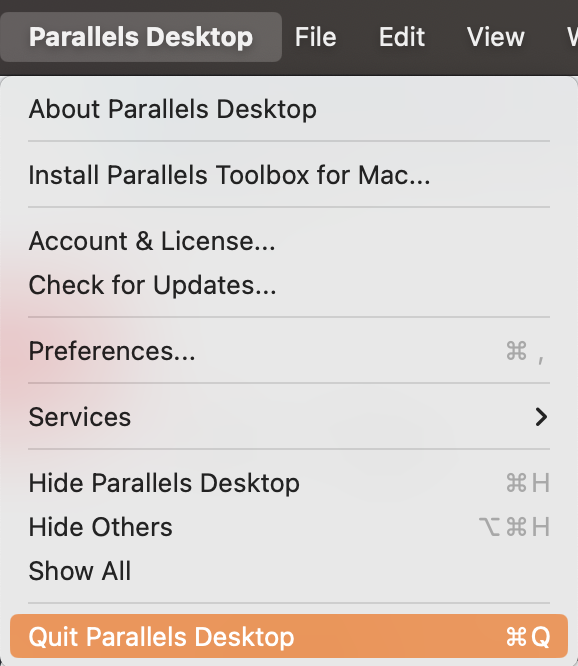1. Shut down your virtual machine and quit Parallels Desktop.