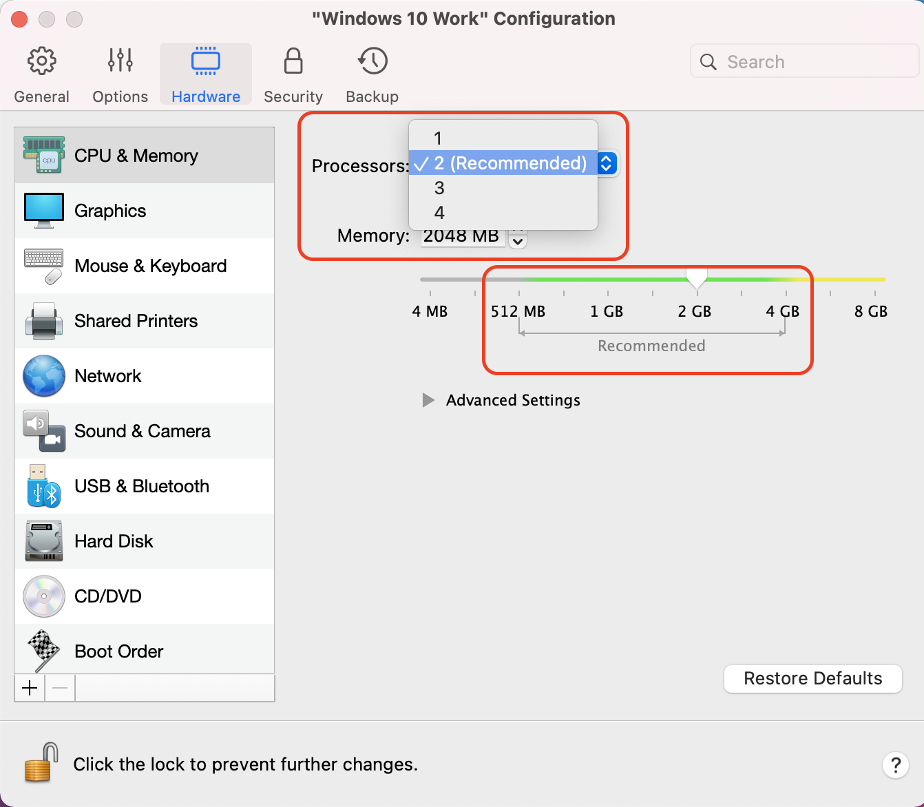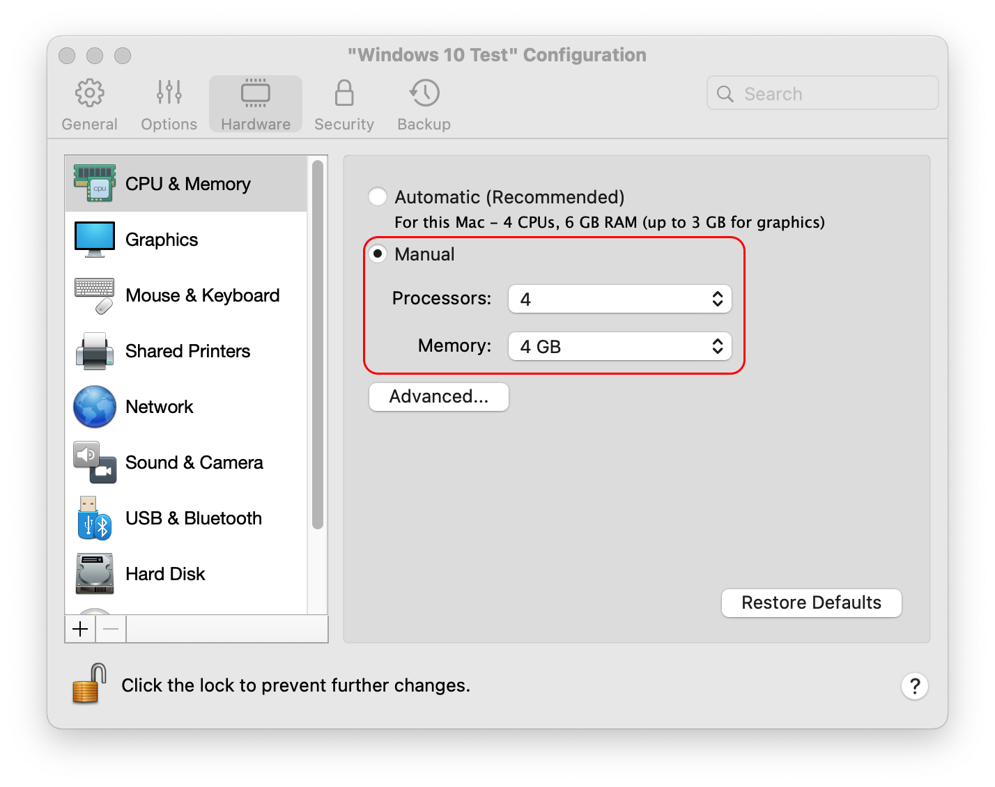 1. Open the virtual machine configuration > Hardware > CPU & Memory > Manual and increase both RAM value and the number of virtual CPUs. In most cases, half of the total CPUs will provide optimal performance. Assigning more than half of CPUs for the virtual machine may cause performance degradation for both Mac and VM. Similarly to processors, the best practice is to assign half of Mac's total RAM.