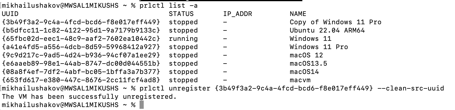 4. Unregister the virtual machine to clear the VM Source UUID for the virtual machine by executing the command below. It'll be regenerated automatically once the virtual machine is registered on the end user's Mac that will regenerate the SMBIOS ID.