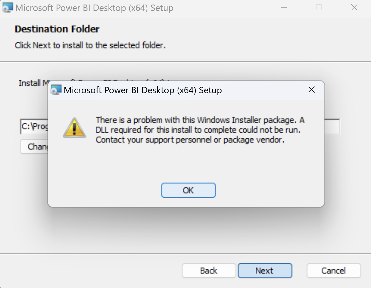 Note: if you encounter the error message below, delete the installer of Power BI, restart Windows 11 and repeat the steps above: