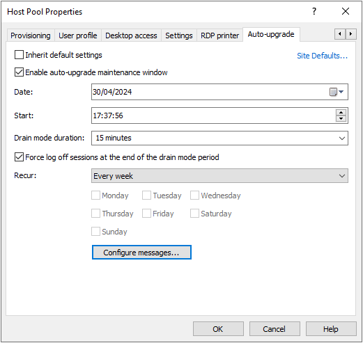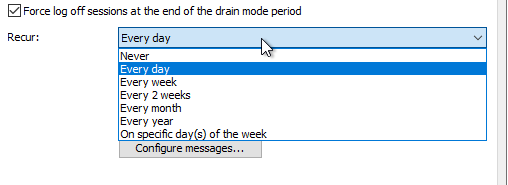 A maintenance window can be set on hostpools, together with options to a drain mode duration and whether to force logoff sessions at the end of the drain window.