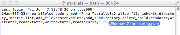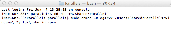 Instead of /path_to_virtual machine_bundle, insert the real path to the .pvm bundle you want to share. The easiest way to do this is to drag and drop the virtual machine's bundle icon next to the sudo chmod -R og+rwx like this: